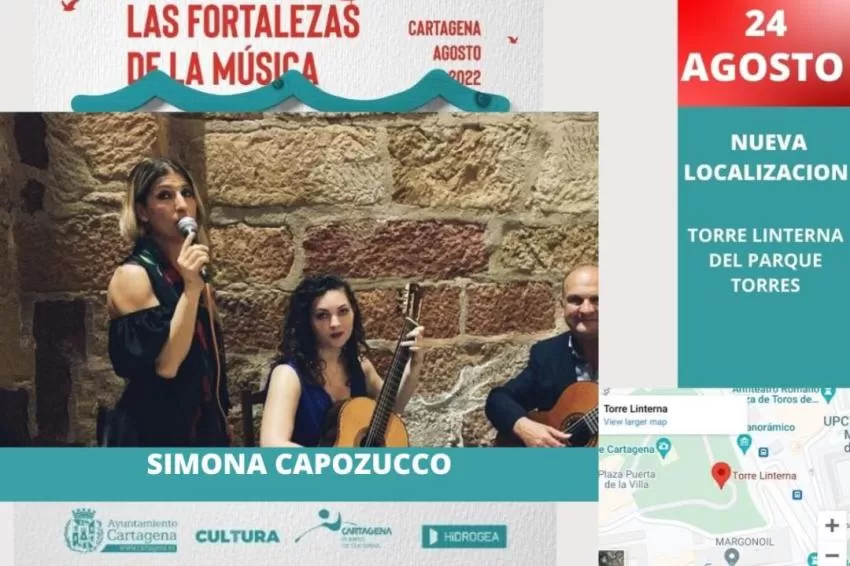 El ciclo de conciertos Las Fortalezas de la Música continúa poniendo en valor emplazamientos de interés histórico y cultural de Cartagena. Este miércoles llega el turno de Simona Capozucco Trío, en la Torre Linterna del Parque Torres, a las 20.30 horas. La entrada es gratuita, aunque requiere reserva previa en la lista de espera de la página web de la Concejalía, puesto que están agotadas.