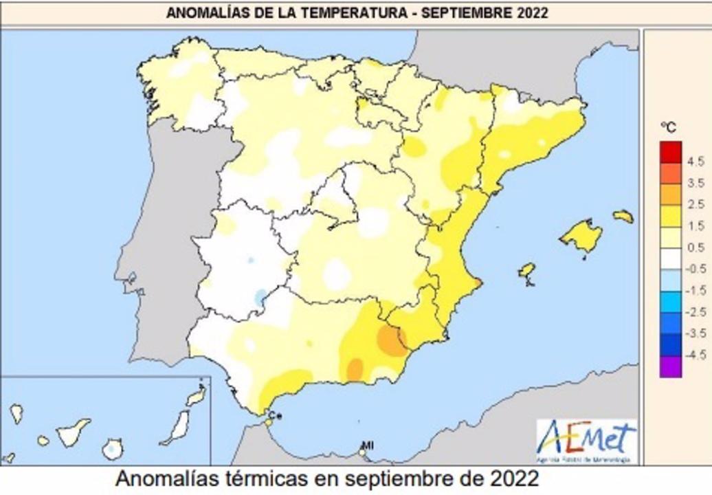 Septiembre ha sido extremadamente cálido en la costa sureste peninsular, muy cálido en el resto de la costa mediterránea, cálido en el centro y en el cuadrante noroeste peninsular, y normal o frío en Extremadura, sur de Castilla y León y extremo occidental de Andalucía. En Baleares tuvo un carácter muy cálido o extremadamente cálido, mientras que en Canarias presentó un carácter muy variable de unas zonas a otras, resultando en conjunto normal.