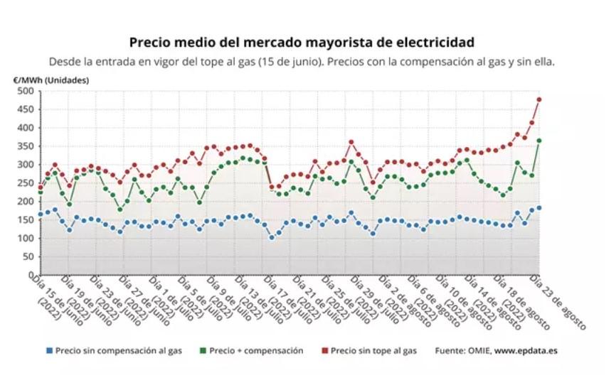 Evolución del precio de la luz con y sin compensación al gas - EPDATA
