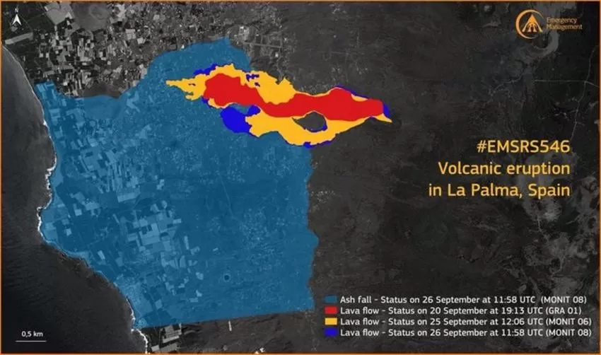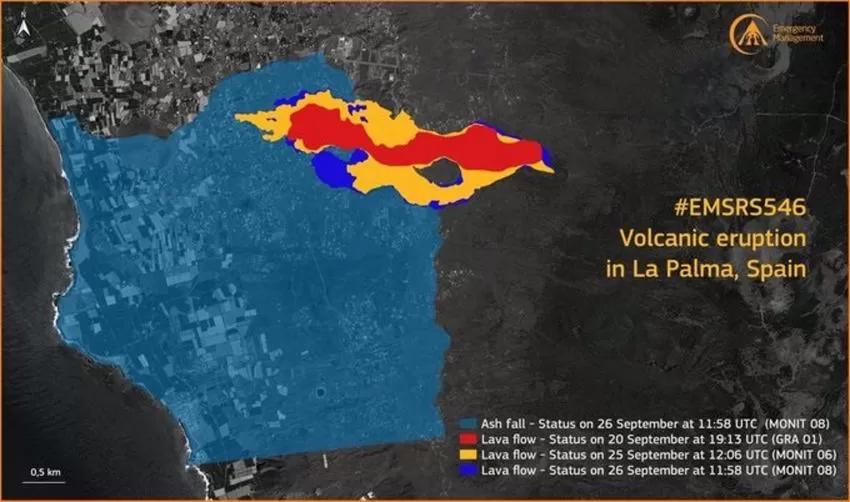 La lava que sale del volcán de 'Cumbre Vieja', en El Paso (La Palma), ha cubierto desde que comenzó la erupción el domingo, 19 de septiembre, un total de 258 hectáreas, lo que implica 20,5 hectáreas más que el muestreo anterior, según el seguimiento por satélite del programa Copérnicus de la Unión Europea.