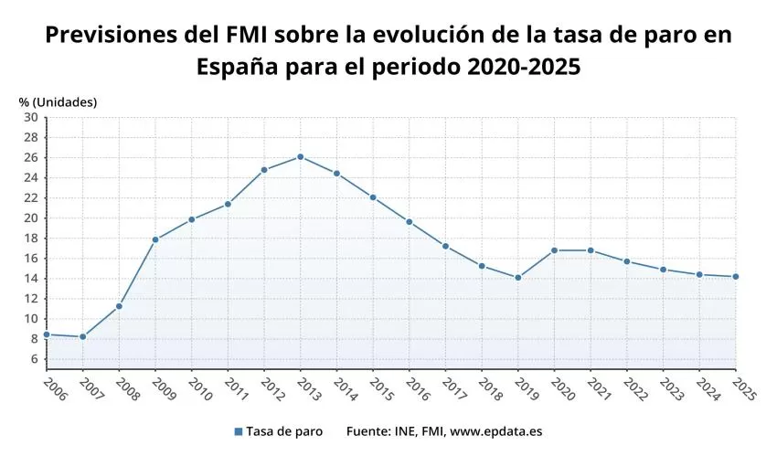 La estimación del FIM -Fondo Monetario Internacional- es que la tasa de paro de España tendrá una evolución poco favorable. Esto se da como consecuencia de la crisis que ha generado la pandemia. La estimación es que en alcance los niveles que tuvo en 2019 -un 14,1%- en 2026.
