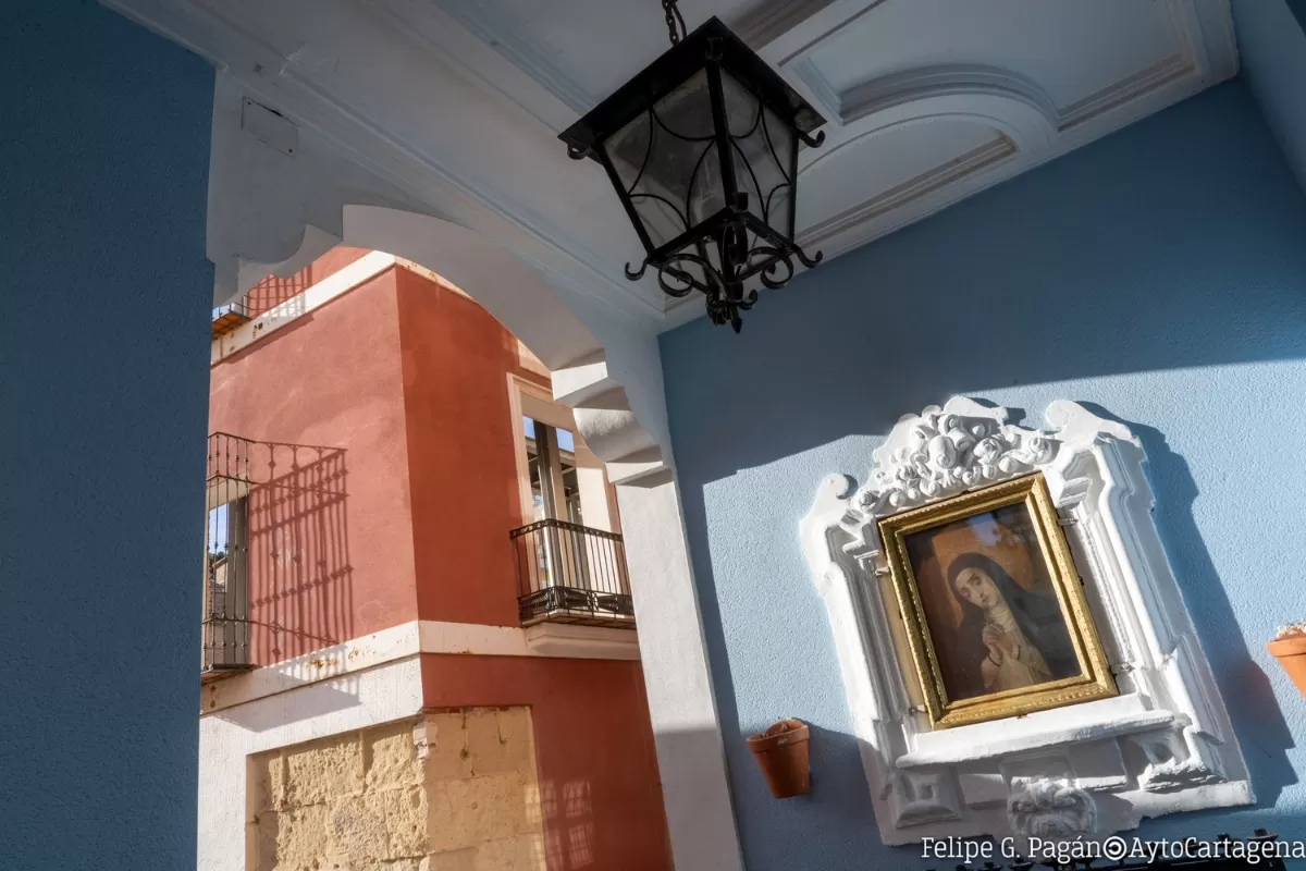 El callejón de la Soledad recupera el cuadro de la Virgen tras ser restaurado por el Ayuntamiento de Cartagena. El concejal delegado de Cultura, Nacho Jáudenes, ha explicado que estos trabajos desarrollados en el Taller Municipal de Restauración han permitido conocer que el autor es Francisco Portela.