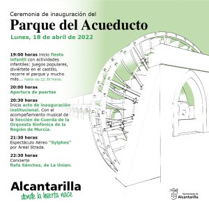 La ceremonia inaugural del Parque del Acueducto romano de Alcantarilla será el próximo lunes, 18 de abril, a partir de las 19.00 horas, y contará con una fiesta infantil, la actuación de la sección de Cuerda de la Orquesta Sinfónica de la Región de Murcia, el espectáculo de danza aérea 'Sylphes' y el concierto de Rafa Sánchez, de La Unión.