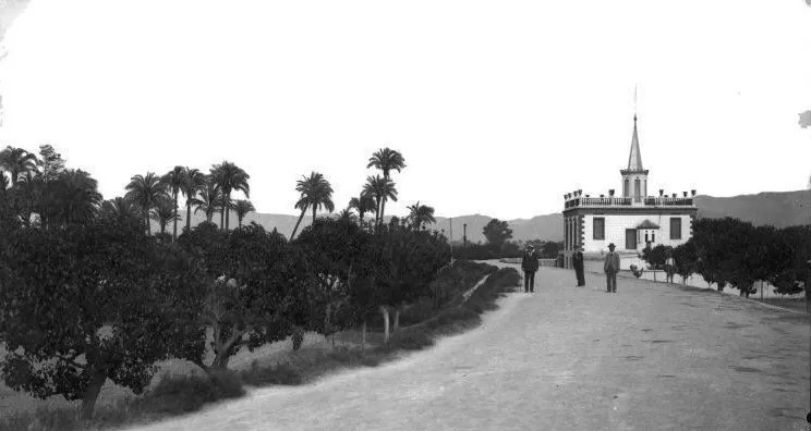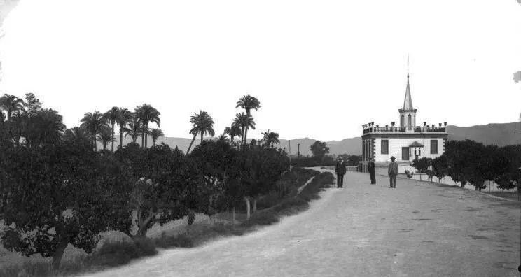 Mientras se sirve un exquisito champagne frappé, los variopintos invitados charlan bajo la rosada luz del atardecer, bien acompañada por las bombillas que a modo de farolillos, cuelgan de los naranjos y limoneros plagados de azahares de delicioso aroma que ocupan todo el jardín. Entre los asistentes, se encuentran algunos de sus más íntimos amigos llegados de toda España: desde la actriz y empresaria teatral María Guerrero, hasta el Nobel de Literatura Jacinto Benavente, pasando por Tórtola Valencia, afamada bailarina y coleccionista de arte, otra de las mujeres más controvertidas y adelantadas a su tiempo. En algún momento de la divertida velada, antes del anochecer, Gloria encuentra oportuno que sus invitados la acompañen al terrado de la cúpula, desde el cual se divisa, justo enfrente, un impresionante palmeral que, rodeado y bañado por la acequia Belchí, hoy ocupa el vivero municipal del Malecón. Girando la vista al este, la gallarda torre catedralicia les saluda, y todos ellos quedan embelesados por la inefable belleza del paisaje huertano que les rodea.
