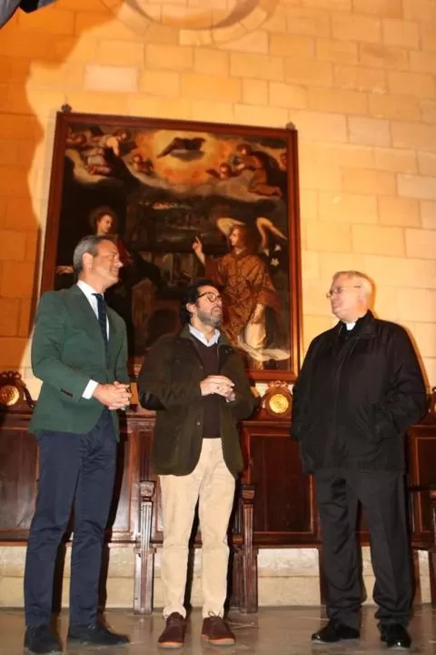 El consejero de Presidencia, Turismo, Cultura y Deportes, Marcos Ortuño, ha hecho la entrega de esta pintura, de gran formato, que atiende uno de los temas religiosos más representativos de la iconografía cristiana, en un acto al que también asistió el obispo de la Diócesis, José Manuel Lorca Planes.