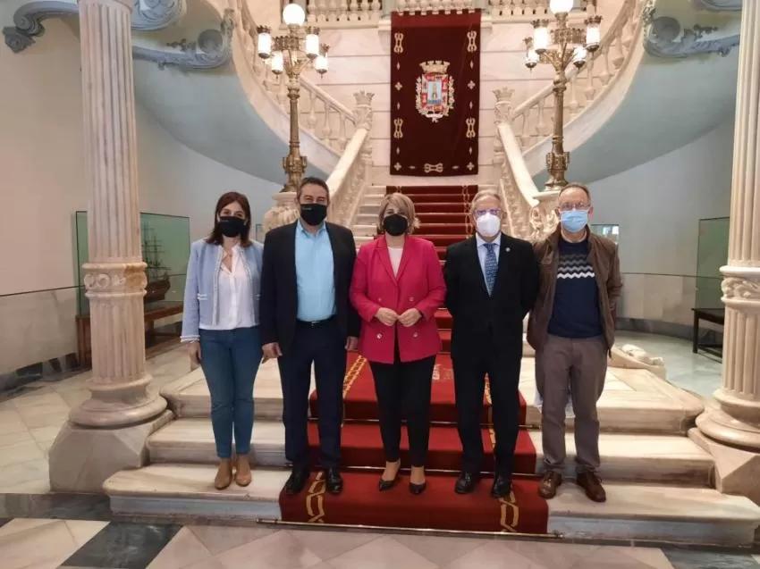 El alcalde de Alcantarilla, Joaquín Buendía, acompañó hoy al presidente de la Asociación de Amigos del Museo de la Huerta, Pedro Marín, en su visita al Ayuntamiento de Cartagena, donde fue recibido por la alcaldesa, Noelia Arroyo.