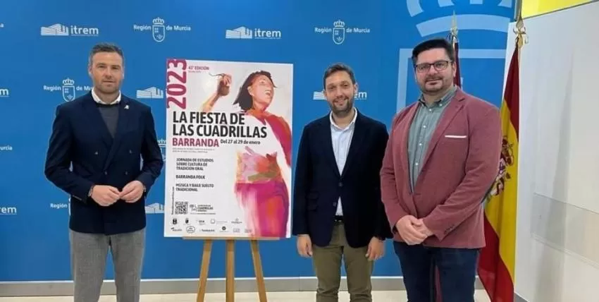 El director del Instituto de Turismo de la Región de Murcia, Juan Francisco Martínez, el alcalde de Caravaca de la Cruz, José Francisco García, y el presidente de los Aguilanderos de Barranda, Carlos Manuel Salcedo, han presentado este jueves el cartel anunciador y la programación, que se extenderá del 27 al 29 de enero e incluye, además del encuentro de cuadrillas del domingo, la Jornada de Estudios sobre Cultura de Tradición Oral, el festival Barranda Folk y diferentes talleres divulgativos.