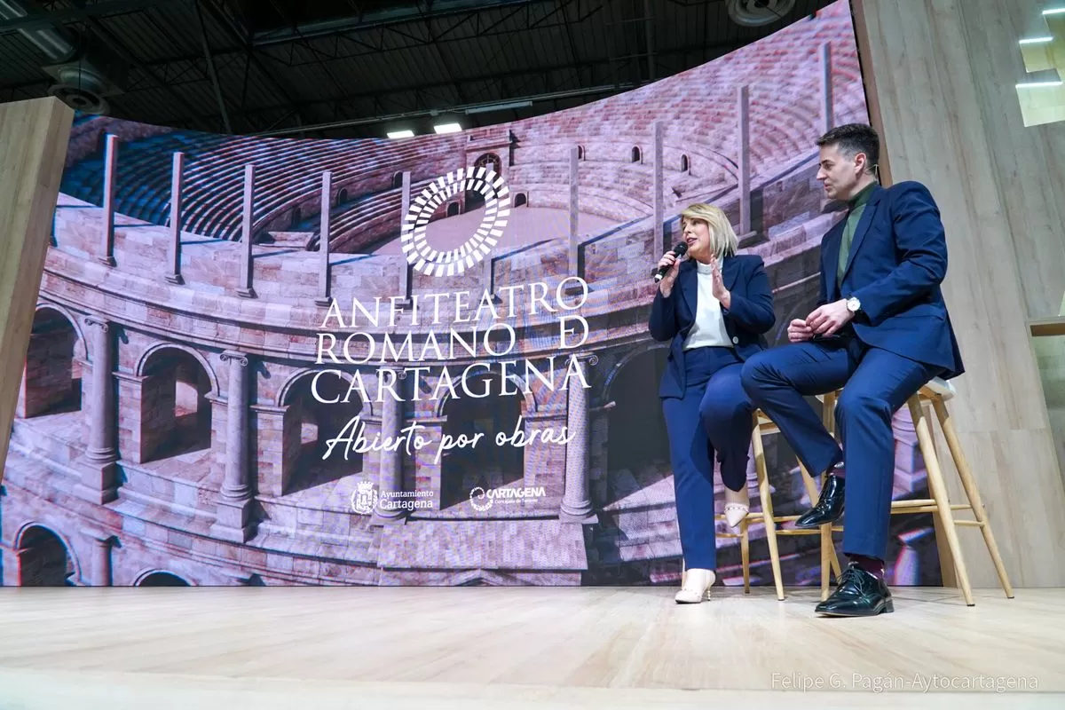 El Abierto por obras del Anfiteatro Romano de Cartagena, que será visitable el próximo verano, ha sido protagonista en Fitur, donde la alcaldesa, Noelia Arroyo, ha presentado los trabajos y el proyecto de excavación que se lleva a cabo, así como los nuevos hallazgos arqueológicos encontrados, con la fossa bestiaria como último descubrimiento, que está despertando gran expectación en el ámbito científico y patrimonial. Al acto celebrado este viernes 26 de enero en Madrid también ha asistido la concejal delegada de Turismo, Beatriz Sánchez.