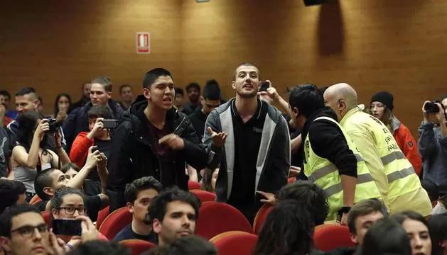 "Desahuciáis a la gente", le ha increpando el joven, rodeado por otra treintena de integrantes de 'Frente Obrero', antes de que el resto del público reaccionara enfadado por la interrupción, con silbidos, abucheos y el grito de "Fuera fascistas de la Universidad". En ese momento, el grupo que trataba de boicotear el acto ha respondido a su vez gritando "fuera vendeobreros de la Universidad".
