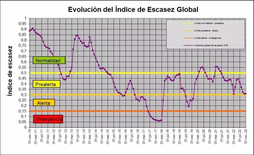 De forma individualizada, el índice de escasez del sistema de la cuenca está en 0,512 (normalidad) sobre 1. Por su parte, el índice de escasez del sistema trasvase está en 0.107 sobre 1 (emergencia).