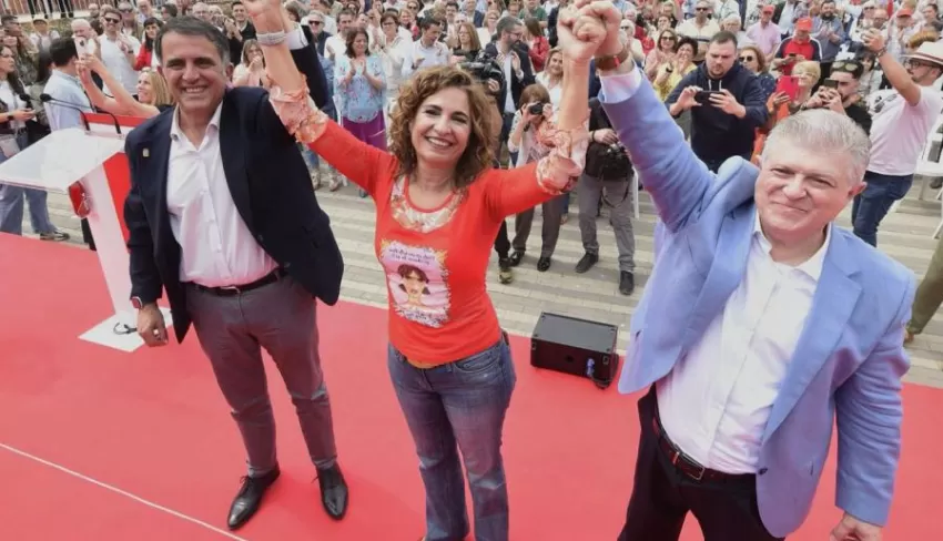 La ministra de Hacienda y Función Pública y vicesecretaria general del PSOE, María Jesús Montero, y el secretario general del PSRM y candidato a la presidencia de la Comunidad, José Vélez, han arropado este sábado al candidato del PSOE al Ayuntamiento de Murcia, al alcalde José Antonio Serrano.