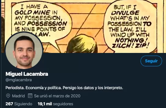 Muchos son los que se afanan en encontrar ahora quién está detrás de Miguel Lacambra y, sobre todo, los que buscan saber si sus publicaciones tienen algún sesgo político, ya que esto se produce en un momento en el que la profesión periodística y los medios de comunicación se afanan por trabajar con máxima profesionalidad y defender la información fiable y contrastada, precisamente frente al peligro que entrañan para la opinión pública los bulos, las 'fake news' o los análisis y opiniones anónimos como los de este perfil.
