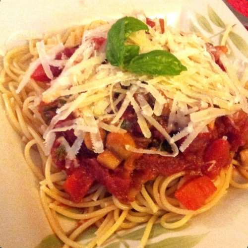 Espaguetis veganos de cebolla, tomate y albahaca Pastas Espaguetis veganos de cebolla, tomate y albahaca