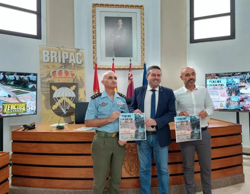 El alcalde de Alcantarilla, Joaquín Buendía, el Coronel Jefe del Regimiento de Infantería ‘Zaragoza’ 5 de Paracaidistas, Guillermo García, y el director general de la Asociación Tercios Legend, Iñaki Urroz, presentaron hoy esta prueba, “que por primera vez se celebra en el municipio en torno a los actos que cada año organizamos para celebrar el Día de la Fiesta Nacional, con el Homenaje a la Bandera, como llevamos haciendo en los últimos 14 años”, destacó el alcalde.