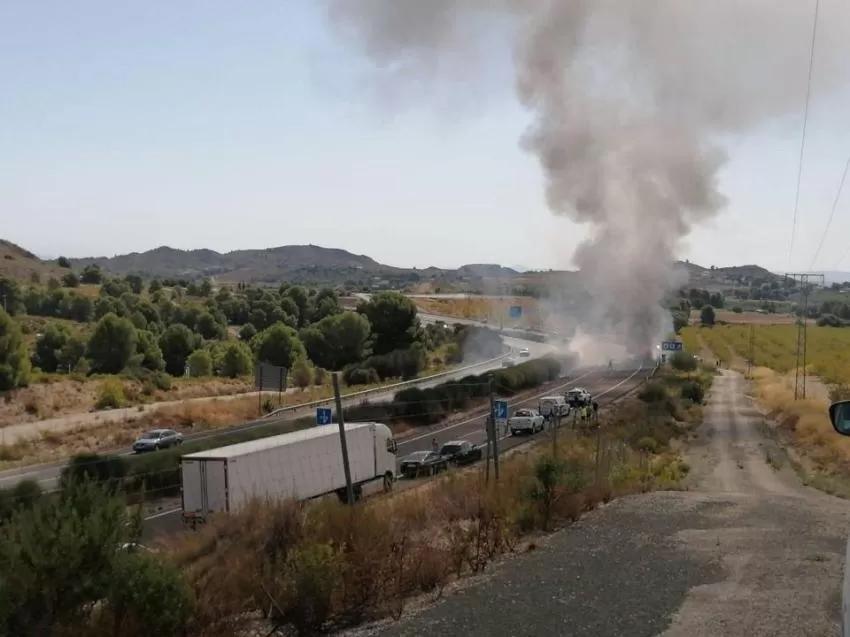 El 1-1-2' ha recibido un gran número de llamadas a partir de las 11.03 horas que alertaban de que un autobús estaba ardiendo a la altura del punto kilométrico 31 de la citada vía, en sentido Murcia.