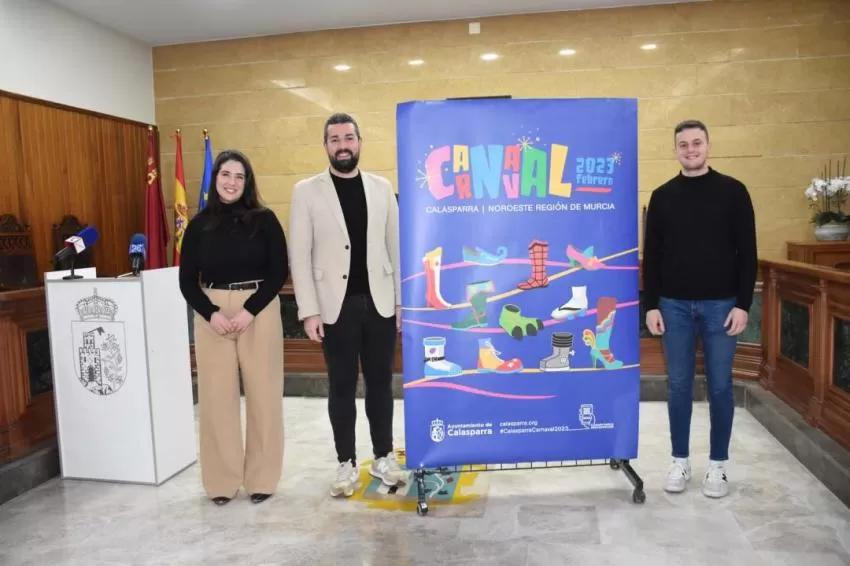 El concejal de Cultura y Festejos, Antonio Merino, acompañado por los concejales del Equipo de Gobierno, Cristina Ruiz y Juan José López, presentaron ayer el cartel oficial y la programación del Carnaval 2023 en Calasparra.