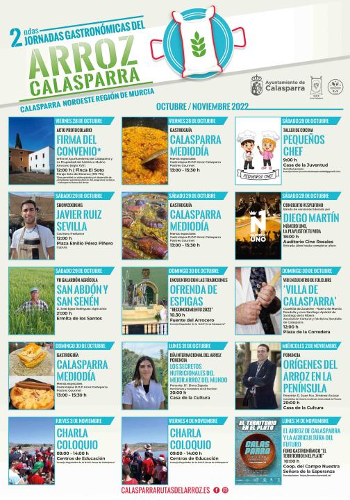 Con motivo de la celebración del Día Internacional del Arroz el día 31 de octubre, Calasparra realizará las II Jornadas Gastronómicas del Arroz , que iniciaron su andadura el pasado año. Para ello se han programado distintas actividades durante los meses de octubre y noviembre.
