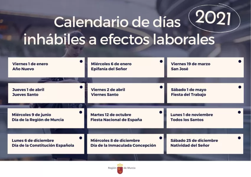 Los otros 3 festivos, para completar los 11 en total, que se darán a los murcianos llegarán el próximo 6 de enero, tradicional día de reyes y Epifanía del Señor. En marzo contaremos con el viernes 19 de marzo, San José, y el Día de la Región de Murcia, 9 de junio. Por otra parte, cada ayuntamiento de los municipios de la Comunidad Autónoma deberán asignar dos días más festivos para cada localidad.