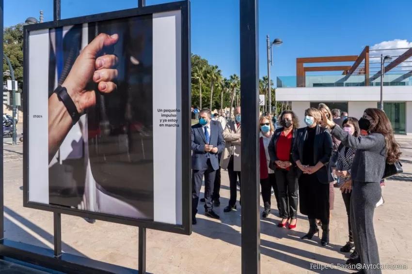 La alcaldesa de Cartagena, Noelia Arroyo, ha inaugurado la exposición 'Anónimos imprescindibles', de la artista Blanca Perezcarro, con la que la empresa Gesa Mediación ha querido realizar un homenaje al transportista, junto a la patronal FROET, y a la que ha acudido la presidenta de la Autoridad Portuaria de Cartagena, Yolanda Muñoz; Pedro Díaz, presidente y Manuel Perezcarro, secretario general de la Federación del transporte.