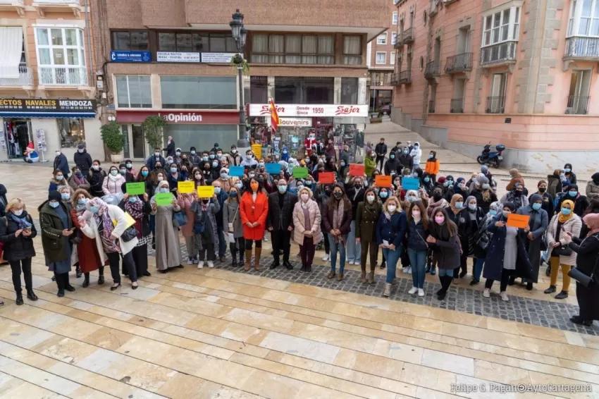 El acto ha contado con la participación de la concejala delegada de Servicios Sociales, Mercedes García, la concejala de Transparencia, Alejandra Gutiérrez, y de la coordinadora de Servicios Sociales, Beatriz Jurado, además de por todas las organizaciones que conforman la Mesa de la Mujer Migrante, como son Cepaim, Accem, Rascasa, Murcia Acoge, Proyecto Abraham, Fisat, Columbares, Cruz Roja, Cáritas La Palma, Encajeras de San Antón, Federación de Asociaciones de Vecinos Cartagena y Comarca, Concejalía de Igualdad y Talleres de Promoción de la Mujer Inmigrante de los Centros Interculturales.
