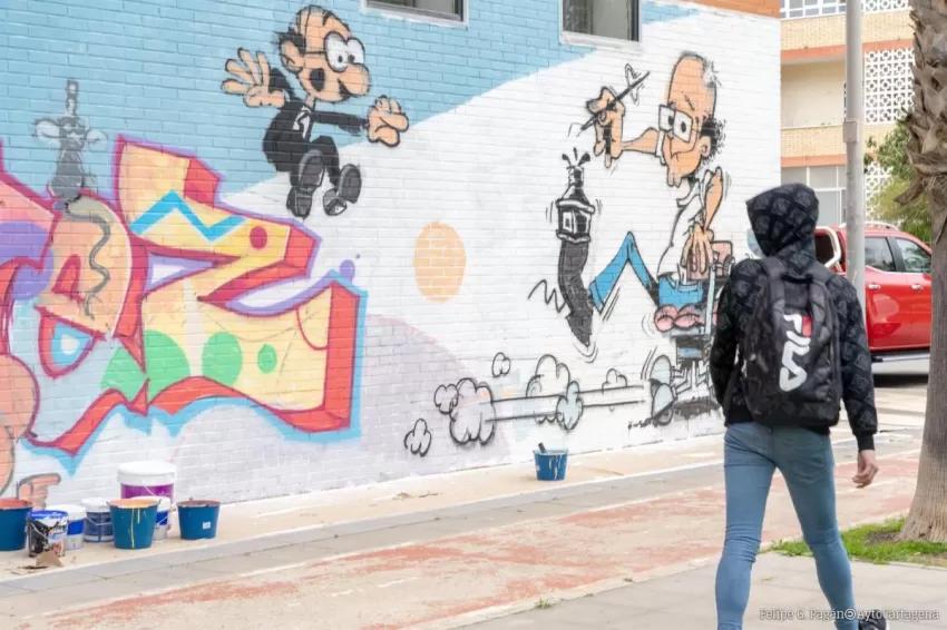 Con motivo de la exposición de calle '¿Pintas o dibujas? Un paseo por el arte de la mano del cómic', organizada por Acción Cultural Española y el Ayuntamiento de Cartagena, se ha organizado paralelamente un programa de actividades como la realización de un grafiti homenaje a Ibáñez en una pared exterior del Centro Cultural Ramón Alonso Luzzy.