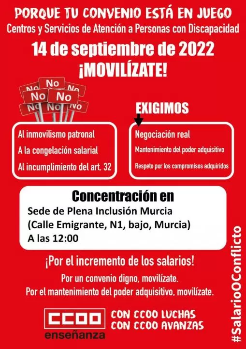 CCOO ha convocado una concentración para este miércoles, a las 12.00 horas, frente a la sede de Plena Inclusión en Murcia, con el fin de reclamar la elaboración de un "convenio digno" para los trabajadores de centros y servicios de atención a personas con discapacidad, según han informado fuentes de la organización en un comunicado.