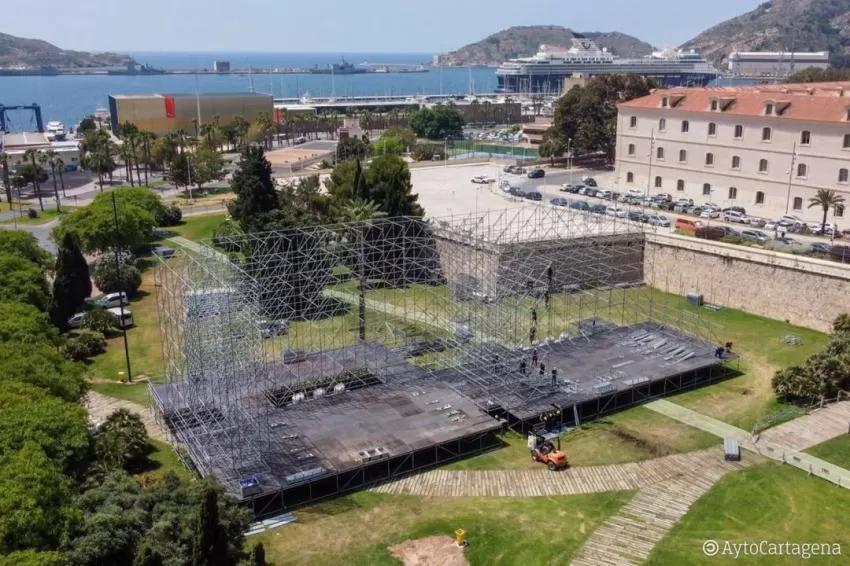 Más de veinte personas llevan trabajando desde el domingo 29 de mayo en el mayor escenario que se ha creado nunca en Cartagena, cinco veces mayor que el de la sala Isidoro Máiquez de El Batel.