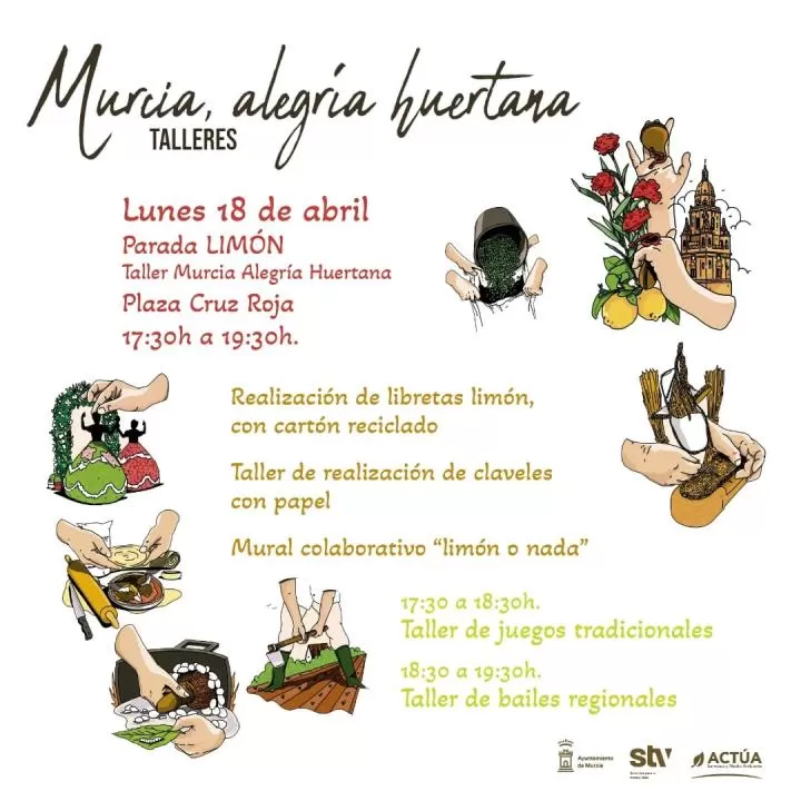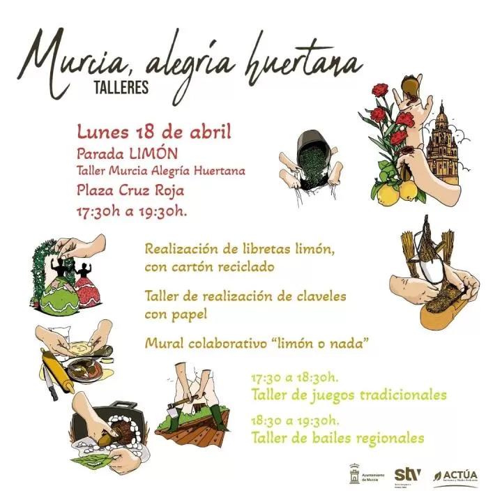 Murcia acogerá los talleres del programa 'Murcia, Alegría Huertana' que se desarrolla, desde este lunes, en diversas plazas y jardines de la ciudad durante estas Fiestas de Primavera, según han informado fuentes municipales en un comunicado.