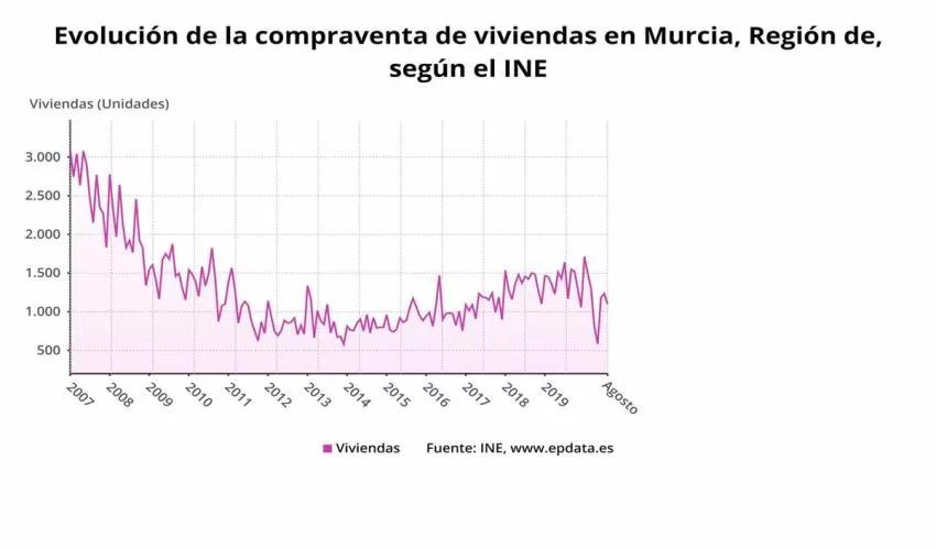 La compraventa de viviendas en la Región de Murcia en el mes de agosto descendió un 6,1 por ciento respecto al mismo mes del año anterior, hasta las 1.097 operaciones. Frente a la caída del 12,1 por ciento de la media nacional.