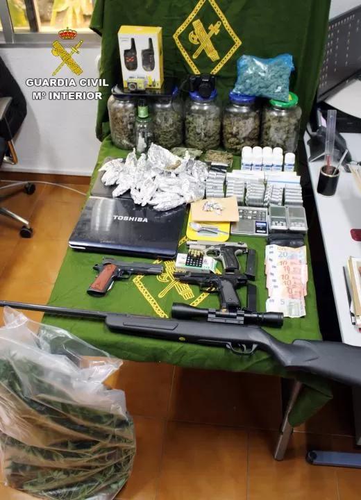 Según han informado fuentes de la Benemérita en un comunicado, se han intervenido 200 plantas de cannabis sativa, un kilo y medio de cogollos de marihuana, varias dosis de cocaína y 2.500 pastillas de ansiolíticos, además de tres pistolas detonadoras, una carabina de aire comprimido, dinero en efectivo y equipos informáticos.