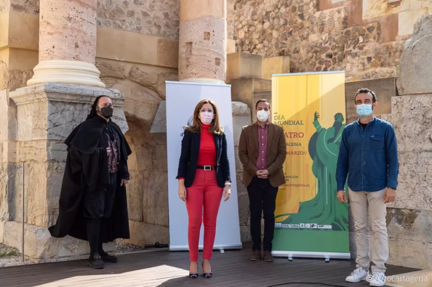 El Ayuntamiento de Cartagena se ha sumado esta mañana a la celebración del Día Mundial del Teatro con un acto, que se ha retransmitido en streaming y que ha contado con la presencia de la alcaldesa de Cartagena, Ana Belén Castejón; el concejal de Cultura David Martínez; y los actores José Gabriel y José Ortas en el Teatro Romano.