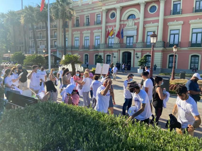 Enfundados con una camiseta blanca y bajo el lema "DIGNIDAD" se aproximaron a la puerta del consistorio y gritaban el mismo lema que lucían en su pecho. Los mensajes más oídos eran simples peticiones como "Alcalde te necesitamos", "Por un barrio digno" o "La Paz es Murcia". Transcurridos unos minutos parece ser que algún despacho oía sus reivindicaciones.