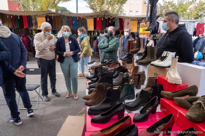 La alcaldesa de Cartagena, Noelia Arroyo, ha visitado el mercadillo del Cénit para comprobar los trabajos recientemente ejecutados de mejora de los puestos y de asfaltado de la zona del aparcamiento, desarrollados por la concejalía de Vía Pública. Junto al edil Juan Pedro Torralba, ha visitado todos los puestos acompañada de los presidentes de la Asociación vendedores de plazas y mercados de Cartagena, Juan Manuel Bautista, y el de Cooperativas de venta ambulante, Pedro Furió.