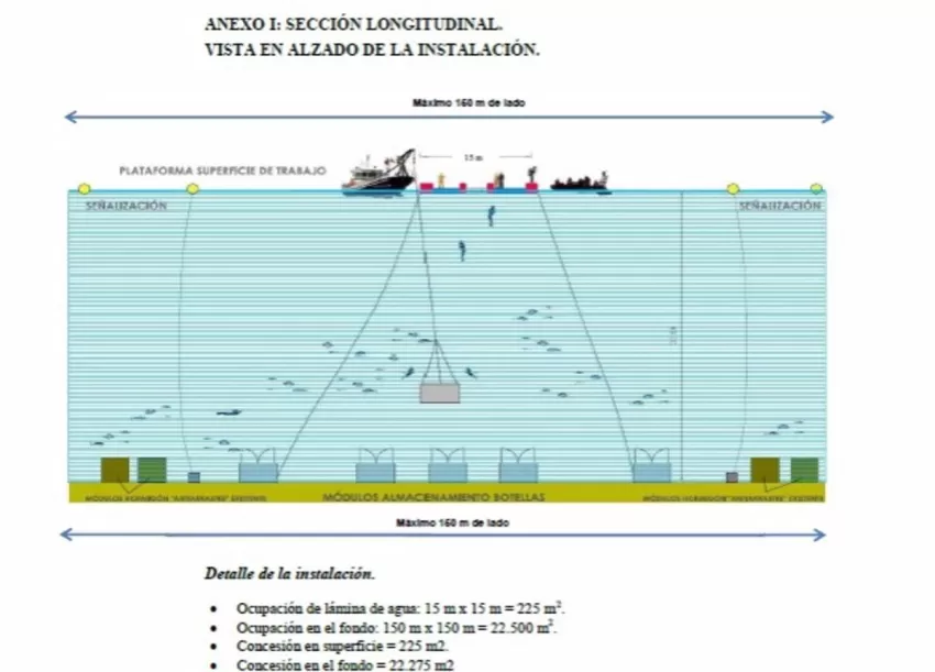 Esta iniciativa abarcará una superficie de 150 metros por 150 metros, entre la isla de Las Palomas o de Los Colomos y la Punta del Moco, a unos 30 metros de profundidad, y está promovida por la empresa, Balizamientos y Obras Hidráulicas de Mazarrón, S.L, que cuenta con más de 15 años de trayectoria profesional en el sector marítimo y subacuático, y cuyo proyecto puede resultar de utilidad para el beneficio del sector de las bodegas.