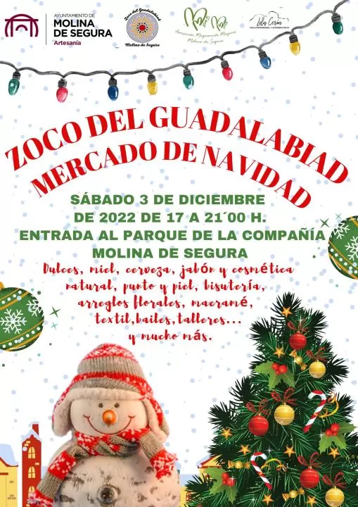 La Concejalía de Artesanía del Ayuntamiento de Molina de Segura invita a una nueva edición del Mercado de Artesanía Zoco del Guadalabiad, que se celebra el sábado 3 de diciembre, de 17.00 a 21.00 horas, en la entrada al Parque de la Compañía.