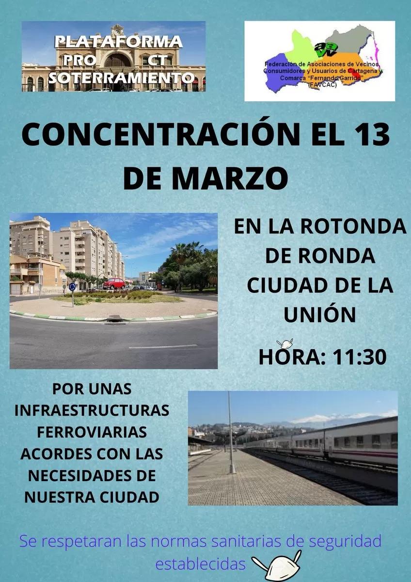 La Federación de Asociaciones de Vecinos, Usuarios y Consumidores de Cartagena y Comarca (FAVCAC) junto a la Plataforma Pro-Soterramiento en Cartagena ha convocado una manifestación para el próximo 13 de marzo en el municipio perteneciente a la ciudad portuaria, La Unión. La asociación sin animo de lucro efectuara la concentración en la rotonda de Ronda Ciudad de la Unión a las 11.30 horas. De esta manera pretenden hacer alusión a las infraestructuras ferroviarias en La Unión, ya que no se encuentran acordes a las necesidades del municipio.