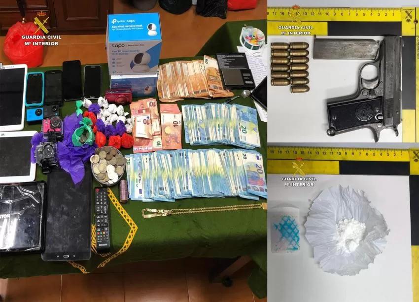 Una vez obtenidos todos los indicios necesarios y previa autorización judicial, se llevó a cabo la entrada y registro del inmueble. En la operación se incautaron: 800 dosis de cocaína; varias pastillas de éxtasis; básculas de precisión para su dosificación y venta; cerca de 17.000 euros; y una pistola del calibre nueve milímetros corto y munición.