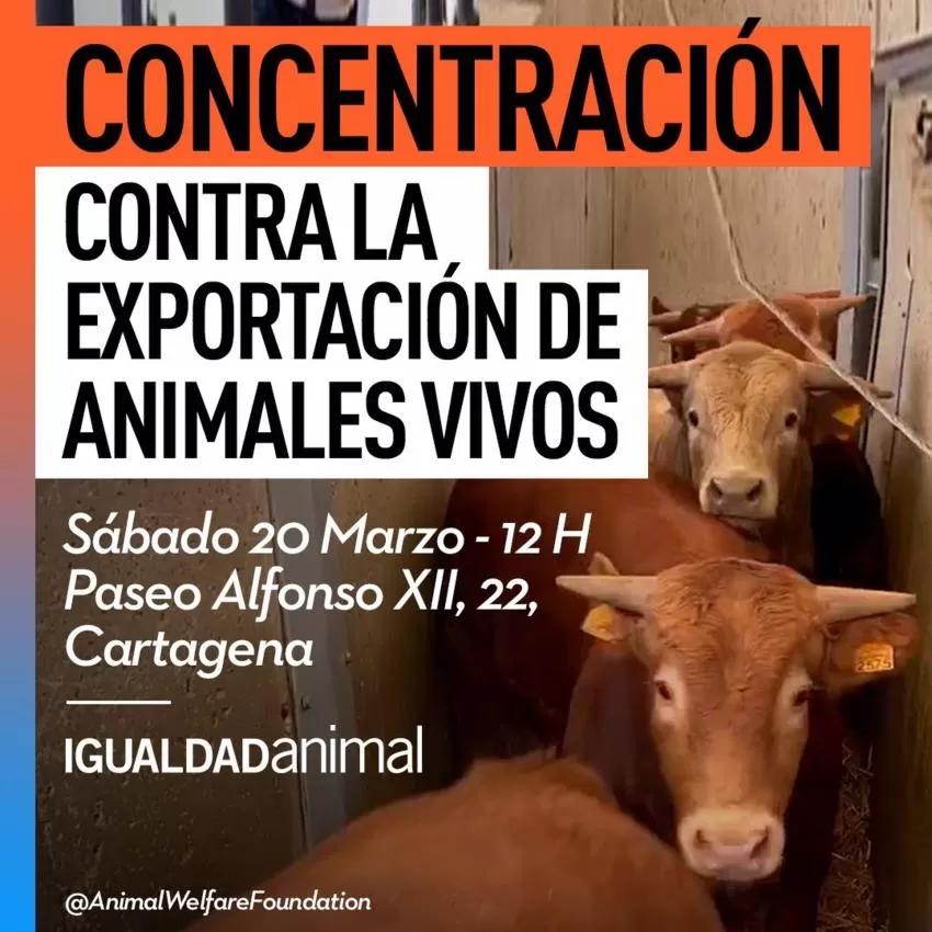 Activistas de la Fundación Igualdad Animal se concentrarán este sábado, a las 12.00 horas, en Paseo Alfonso XII de Cartagena, para reclamar la prohibición de la exportación de animales a países fuera de la Unión Europea (UE), informaron fuentes de la organización en un comunicado.