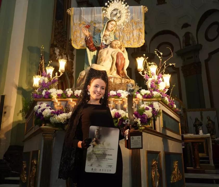 La alcaldesa de Cartagena, Noelia Arroyo; el Hermano Mayor marrajo, Francisco Pagán y el presidente de la Agrupación de Portapasos Promesas de la Virgen de La Piedad, José Jesús Guillén, han entregado a la jovencísima Ana Cayetana este primer premio dotado con 2.100 euros, trofeo-escultura realizado por el escultor Fernando Saénz de Elorrieta y diploma.