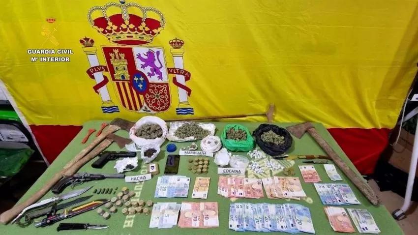 Además de 150 dosis de cocaína, 300 gramos de marihuana en cogollos, 85 gramos de hachís y otros efectos relacionados con el tráfico de drogas, se incautaron más de 2.000 euros en efectivo, teléfonos móviles y diversas armas, entre las que destaca un bastón estoque, considerado como arma prohibida, y dos armas de fuego simuladas.