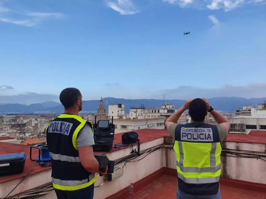 Los agentes no solo volaron las aeronaves no tripuladas para controlar la ciudad desde al aire, sino que también se apostaron en diferentes azoteas de Murcia con el sistema antidrones para impedir que se llevaran a cabo vuelos ilegales, y en su caso, neutralizarlos.