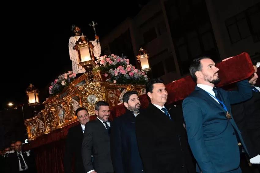 El jefe del Ejecutivo regional, Fernando López Miras, asistió ayer a la procesión en honor a San Francisco Javier, patrón de San Javier, con motivo de las fiestas patronales de la localidad, donde afirmó que es "un honor acompañar a los vecinos de la ciudad y compartir el día grande en esta procesión".