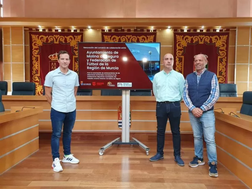 La renovación del convenio de colaboración entre el Ayuntamiento de Molina de Segura y la Federación de Fútbol de la Región de Murcia para la autorización de entrenamientos de las selecciones territoriales murcianas en las instalaciones deportivas municipales del Pabellón Antonio Peñalver de Molina de Segura ha sido presentada en rueda de prensa, hoy viernes 28 de octubre, en el Salón de Plenos del Ayuntamiento.