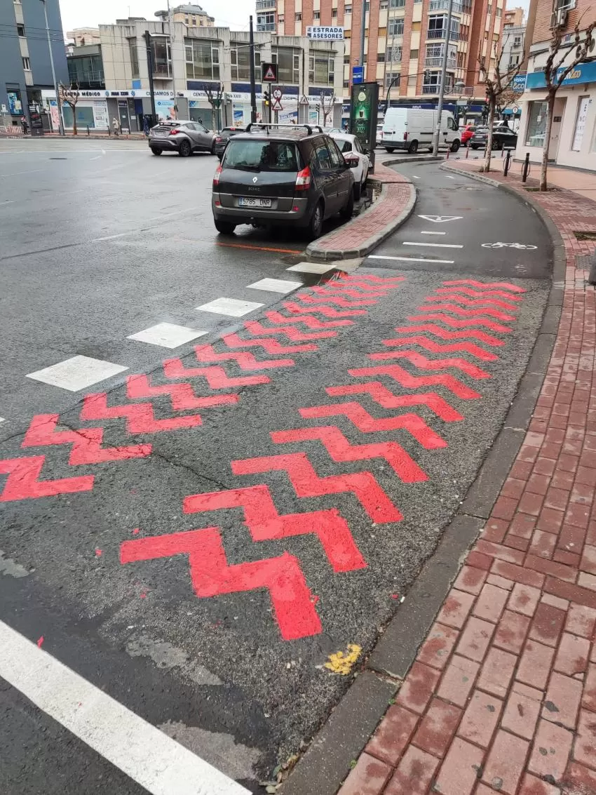 En las distintas calles se utilizará pavimento de color verde para el carril bus, segregado por elementos tipo Zebra de 90 milímetros de altura, y pavimento granate para carril bici separados con bolardos de 100 centímetros de altura.