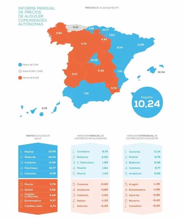 Por su parte, el piso tipo de alquiler en España tuvo en julio de 2022 un precio medio por metro cuadrado de 10,24 euros. Esta cifra arrojó una subida mensual del 0,20 por ciento. En la comparativa interanual, subió un 5,89 por ciento.