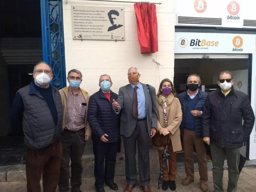 En febrero de 2019 la Junta de Gobierno de la Academia de Ciencias de la Región, a través del académico Ángel Ferrández, presentó al entonces alcalde de Murcia la propuesta de colocar una placa conmemorativa de la visita de Marie Slodowska Curie a Murcia; concretamente almorzó junto a su hija Éve en la brasería que albergaba el entonces hotel Reina Victoria. El Ayuntamiento accedió a la iniciativa de la ACCRM, aunque sufrió el proyecto diversos retrasos.