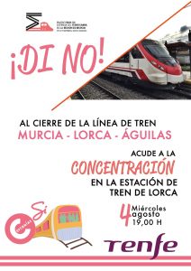 La Plataforma en Defensa del Ferrocarril vuelve a llamar a la población murciana para clamar contra el cierre de vías entre Lorca-Águilas-Murcia. La concentración será esta vez en la Ciudad del Sol, a partir de las 20 horas en la Estación de Sutullena.