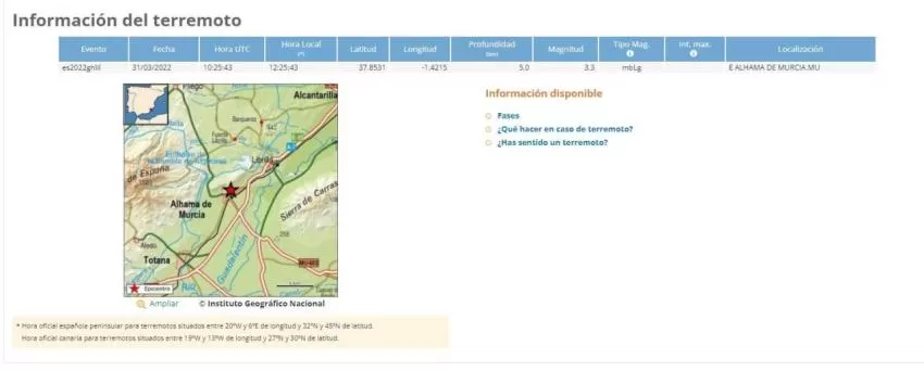 El Instituto Geográfico Nacional ha informado, a través de su Red de Información Sísmica, que a las 12.25 horas ha tenido lugar un movimiento sísmico de magnitud 3.2 y epicentro al este de Alhama de Murcia.