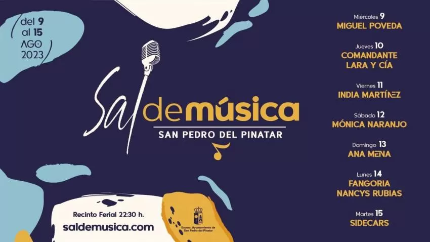 El recinto ferial de San Pedro del Pinatar acogerá del 9 al 15 de agosto la segunda edición del festival 'Sal de Música', con un cartel repleto de estrellas de la talla de Mónica Naranjo, Fangoria y Nancys Rubias, Miguel Poveda, India Martínez, Ana Mena y Sidecars, a los que se suma, para dar el toque de humor Comandante Lara.