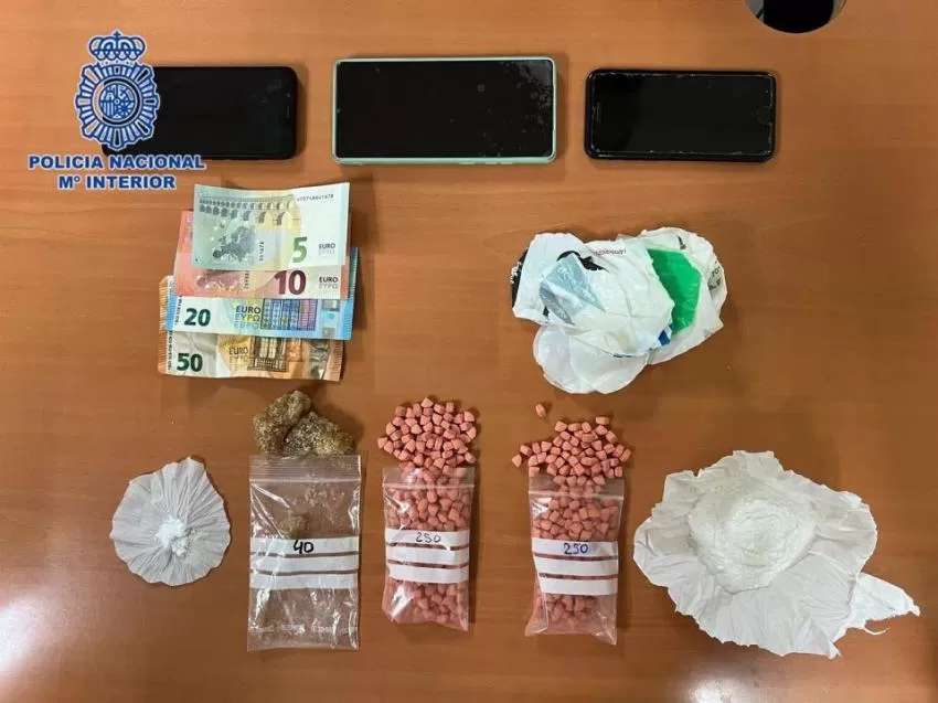 Por todo ello, los agentes procedieron a revisar el edificio donde se había producido la pelea, encontrando a un varón tratando de ocultarse en la última planta del inmueble. Junto a él hallaron una caja metálica con diferentes tipos de drogas: 47 gramos de cocaína, 42 gramos de cristal (metanfetamina o MDMA) y 456 pastillas de éxtasis.